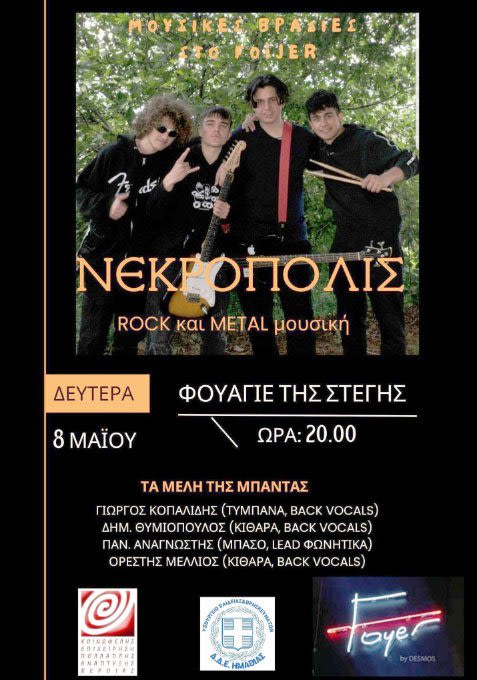 Η ΚΕΠΑ Δήμου Βέροιας σε συνεργασία με την Διεύθυνση Β/θμιας Εκπαίδευσης Ημαθίας προσκάλεσε τους μαθητές/-τριες που ασχολούνται με τη μουσική, έχουν δημιουργήσει μικρά μουσικά σύνολα και επιθυμούν να παρουσιάσουν το πρόγραμμά τους στο φιλόξενο art café foyer της Αντωνιάδειας Στέγης Γραμμάτων και Τεχνών Βέροιας να συμπληρώσουν μια ηλεκτρονική αίτηση συμμετοχής. Αυτό έκαναν οι Necropolis, ένα συγκρότημα ροκ και μέταλ μουσικής και μας προσκαλούν στην πρώτη μουσική βραδιά στο φουαγιέ με τσαγάκι ή κρασάκι, την Δευτέρα 8 Μαΐου 2023, ώρα 8μ.μ.