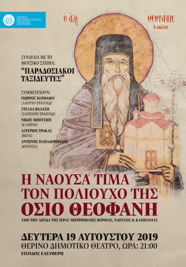 Ο Δήμος Ηρωικής Πόλης Νάουσας προς τιμήν του Πολιούχου Οσίου Θεοφάνους, τον οποίο η πόλη μας τιμά στις 19 Αυγούστου, διοργανώνει πολιτιστική εκδήλωση υπό την αιγίδα της Ιεράς Μητρόπολης Βεροίας, Ναούσης και Καμπανίας.