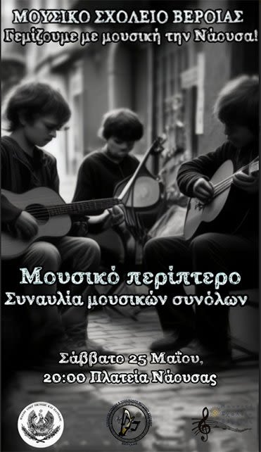 Τα παιδιά του μουσικού σχολείου Βέροιας θα μεταφέρουν το Σάββατο, 25 Μαΐου 2024 στις 8.00 μ.μ., το μουσικό τους περίπτερο στη Νάουσα και θα παίξουν εκεί στην Πλατεία της Νάουσας.