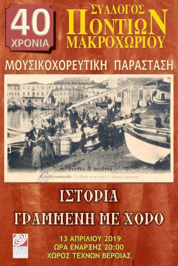 Μια πολύ ενδιαφέρουσα θεατρική παράσταση «Ιστορία Γραμμένη με χορό» θα παρουσιαστεί στις 13 Απριλίου 2019 στις 8 το βράδυ στο Χώρο Τεχνών Βέροιας από το Σύλλογο Ποντίων Μακροχωρίου στο πλαίσιο εορτασμού των σαράντα (40) χρόνων από την ίδρυση του συλλόγου.  Πρόκειται για μία μουσικοχορευτική παράσταση, μια πρωτοβουλία του Συλλόγου Ποντίων Μακροχωρίου, με στόχο να επικοινωνήσει  το λαογραφικό παρελθόν, ό,τι ονομάζεται «άυλοςπολιτισμός», αναδεικνύοντας παράλληλα το ιδιαίτερο μουσικοχορευτικό ύφος των περιοχών του Εύξεινου Πόντου από τη σκοπιά των βιωματικών μουσικών και χορευτών.  Ένα ταξίδι στο παρελθόν με συνοδοιπόρους τους πρεσβευτές του «άυλου πολιτισμού» τους βιωματικούς  μουσικούς και χορευτές που θα δώσουν «χρώμα» και «μυρωδιά» μιας άλλης εποχής στην παράσταση. Στην παράσταση θα παρακολουθήσετε παιδιά 4ης και 5ης γενιάς να μιλούν την ποντιακή διάλεκτο, να κάνουν αγροτικές εργασίες, να παίζουν παιχνίδια και μουσικά όργανα των προσφύγων παππούδων τους, να τραγουδούν και να χορεύουν με το ύφος των μακρινών προγόνων τους. Τα περισσότερα νέα παιδιά που συμμετέχουν στην παράσταση δεν είχαν την δυνατότητα ή την τύχη να μεγαλώσουν με ανθρώπους που διατηρούσαν νωπές τις μνήμες των αλησμόνητων πατρίδων τους, εντούτοις αγαπούν και βιώνουν την ποντιακή παράδοση μέσα στη μεγάλη αγκαλιά του Συλλόγου Ποντίων Μακροχωρίου. Νέοι άνθρωποι σμίγουν μέσα τους το παρελθόν και το μέλλον. Διψούν για γνώση, έμπνευση και συγκίνηση και καθιστούν την προσπάθειά αυτή όχι μόνο ελκυστική αλλά και συλλεκτική. Το σενάριο, τη λαογραφική έρευνα και τη διδασκαλία του χορού έχει επιμεληθεί ο Βασίλης Ασβεστάς ενώ συμμετέχουν συνολικά πάνω από 170 χορευτές και ηθοποιοί!