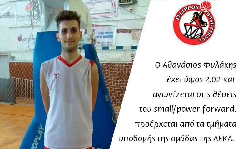 Η ΔΕ του τμήματος καλαθοσφαίρισης του ΑΠΣ Φίλιππος Βέροιας με χαρά ανακοινώνει την απόκτηση του Αθανάσιου Φυλάκη για την αγωνιστική σαιζόν 2019-20. Ο νεαρός 18χρονος αθλητής (22/01/2001) έχει ύψος 2.02 και αγωνίζεται στις θέσεις του small/power forward.