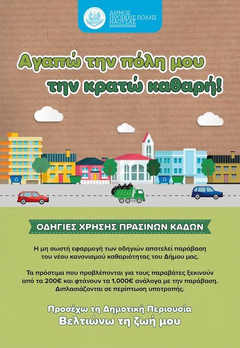 Με στόχο και πάλι την καλύτερη ενημέρωση των δημοτών, ο Δήμος Νάουσας ετοίμασε ειδικό καλαίσθητο φυλλάδιο, που θα μοιραστεί σε όλους τους δημότες, για τη χρήση των πράσινων κάδων. Τα έντυπα θα κυκλοφορήσουν τις επόμενες μέρες και θα μοιραστούν στην πόλη και στις τοπικές κοινότητες. Στόχος του Δήμου Νάουσας είναι η καλύτερη διαχείριση της νέας πραγματικότητας στον τομέα της καθαριότητας και η αρτιότερη εφαρμογή από όλους του νέου κανονισμού, γεγονός που θα οδηγήσει σύντομα σε μια νέα εποχή καθαριότητας και συνυπευθυνότητας στη δημοτική περιουσία. Ταυτόχρονα η υπηρεσία καθαριότητας ελέγχει τις όποιες δυσλειτουργίες παρουσιάζονται στο πλαίσιο των νέων διαδικασιών περισυλλογής των απορριμμάτων και δίνει άμεσες λύσεις.
