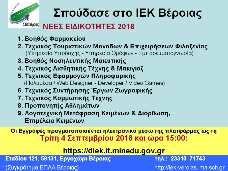 Νέες ειδικότητες στο Δημόσιο ΙΕΚ Βέροιας