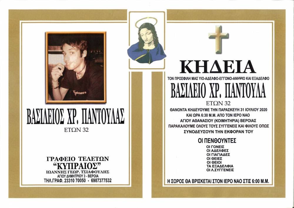 Νεκρός βρέθηκε σήμερα τα ξημερώματα στην Βέροια, κάτω από αδιευκρίνιστες συνθήκες ο 32χρονος Βασίλειος Παντούλας. Τον άτυχο άνδρα βρήκε στο σπίτι του η γιαγιά του.