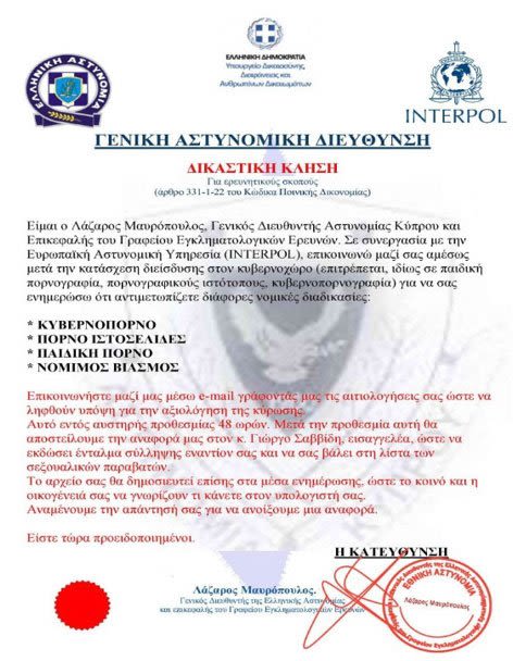 Μάλιστα, στην προσπάθειά τους να προσδώσουν «αληθοφάνεια» στη σχετική επιστολή, χρησιμοποίησαν το λογότυπο του Υπουργείου Προστασίας του Πολίτη, της Ελληνικής Αστυνομίας και της Interpol, εντύπωμα σφραγίδας της Κύπρου με δήθεν υπογραφή του Αρχηγού της Ελληνικής Αστυνομίας, επιχειρώντας να δημιουργήσουν την εντύπωση ότι προέρχεται από την Ελληνική Αστυνομία.