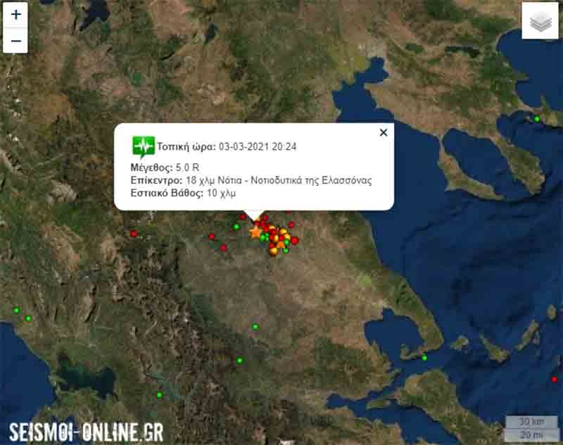 Νέα σεισμική δόνηση μεγέθους 5 Ρίχτερ σημειώθηκε πριν λίγα λεπτά στις 20:24 το βράδυ της Τετάρτης με επίκεντρο 18χλμ Νοτια-Νοτιοδυτικά της Ελασσόνας με εστιακό βάθος 10 χλμ, σύμφωνα με το Γεωδυναμικό Ινστιτούτο.