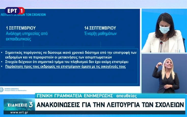 Η Νίκη Κεραμέως ανακοίνωσε ότι τα σχολεία θα ανοίξουν στις 14 Σεπτεμβρίου. Ο αρχικός προγραμματισμός ήθελε τους μαθητές να επιστρέφουν στα θρανία στις 7 Σεπτεμβρίου όμως τα αυξημένα κρούσματα των τελευταίων ημερών και η επιστροφή οικογενειών από διακοπές έφερε τη μεταφορά της έναρξης της σχολικής χρονιάς 2020 – 2021, μία εβδομάδα μετά.