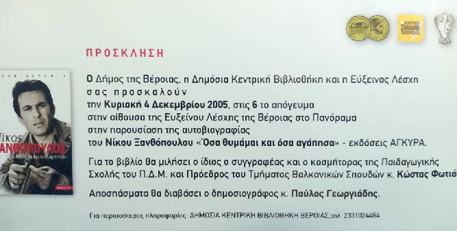 Δεν τον αποκαλούσαν τυχαία το «Παιδί του Λαού», αφού ήταν από τους πιο αγαπημένους Έλληνες ηθοποιούς και τραγουδιστές. Ο Νίκος Ξανθόπουλος, έφυγε προχθές από τη ζωή στα 89 του και σήμερα θα γίνει η κηδεία του. Πέρασαν χρόνια κι όμως δεν ξεχνάμε την παρουσία του στη Βέροια, για την παρουσίαση του βιβλίου του «Όσα θυμάμαι και όσα αγάπησα» (εκδόσεις Άγκυρα) στις 4 Δεκεμβρίου 2005 στη Δημόσια Βιβλιοθήκη, καλεσμένος της Ευξείνου Λέσχης και του Δήμου.