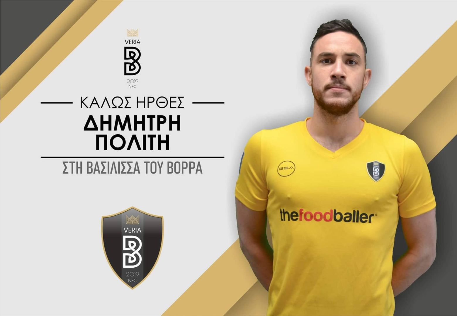 Η ΠΑΕ ΝΠΣ Βέροια ανακοινώνει την απόκτηση του τερματοφύλακα Δημήτρη Πολίτη. Ο νεοαποκτηθείς παίκτης της Βέροιας, γεννήθηκε στις 8 Μαρτίου 1995 και τον τελευταίο 1,5 χρόνο αγωνίσθηκε στον Απόλλωνα Πόντου. Στην δεύτερη τη τάξει κατηγορία του Ελληνικού ποδοσφαίρου, έχει φορέσει τις φανέλες των Πανσεραϊκού, Παναιγιάλειου, Κισαμικού, Ζακύνθου. Την περίοδο 2014-2015 φόρεσε την φανέλα του Πανιωνίου στην Superleague.