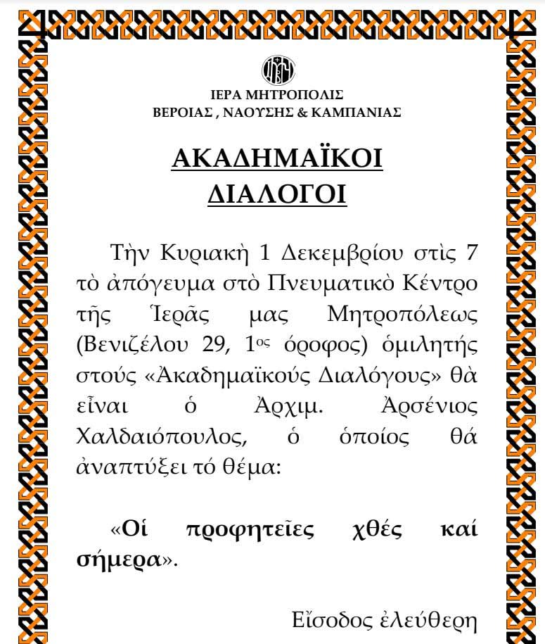 Την Κυριακή 1 Δεκεμβρίου στίς 7 τό ἀπόγευμα στό Πνευματικό Κέντρο τῆς Ἱερᾶς Μητροπόλεώς μας (ἐπί τῆς ὁδοῦ Βενιζέλου), ὁμιλητής στή σειρά ὁμιλιῶν «Ἀκαδημαϊκοί Διάλογοι» θὰ εἶναι ὁ Ἀρχιμ. Ἀρσένιος Χαλδαιόπουλος, ὁ ὁποίος θά ἀναπτύξει τό θέμα: «Οἱ προφητεῖες χθές καί σήμερα».