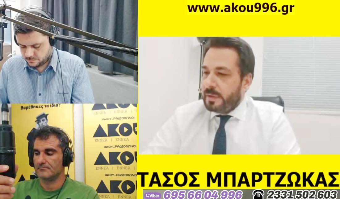 Με αφορμή την πρόσφατη συνάντηση με τον αντιπεριφερειάρχη Κ. Καλαϊτζίδη, ο βουλευτής Ν.Δ. Ημαθίας Τάσος Μπαρτζώκας μίλησε χθες μεσημέρι Τετάρτης, ζωντανά μέσω Skype από το γραφείο του στην Αθήνα με τους Ζήση Μιχ. Πατσίκα και Νίκο Βουδούρη στην εκπομπή ΛΑΪΚΑ&ΑΙΡΕΤΙΚΑ στον ΑΚΟΥ 99,6. Υπογράμμισε ότι τα μεγάλα έργα λείπουν από την Ημαθία και χρειάζεται συστράτευση όλων των πολιτικών δυνάμεων και φορέων για να γίνουν επιτέλους πράγματα στην Ημαθία. «Δεν χρειάζεται να βάλουμε προσωπική ταμπέλα πάνω από τα έργα, ας γίνουν για να κερδίσει η Ημαθία», είπε χαρακτηριστικά ο κυβερνητικός βουλευτής αναφερόμενος κυρίως στο θέμα του Τελωνείου στην Κουλούρα.