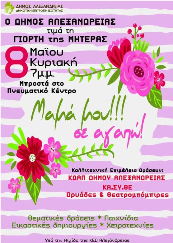 Ο Δήμος Αλεξάνδρειας την Κυριακή 8 Μαΐου 2022 γιορτάζει τη Γιορτή της Μητέρας, με μια σειρά δράσεων και εκδηλώσεων που έχουν τον τίτλο «Μαμά μου σε αγαπώ!!!» μπροστά στο Πνευματικό Κέντρο.