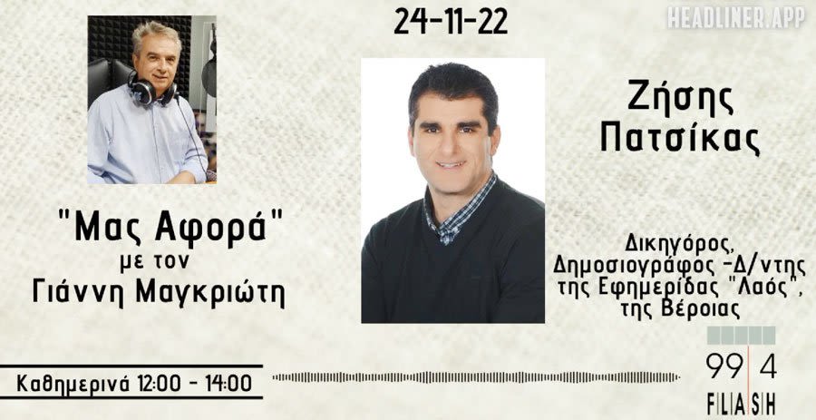 Για την τρέχουσα πολιτική επικαιρότητα και την κατάσταση στην Ημαθία μίλησε το μεσημέρι της Πέμπτης(24/11) ο εκδότης του «ΛΑΟΥ» και δικηγόρος Ζήσης Μιχ. Πατσίκας που ήταν φιλοξενούμενος στην ραδιοφωνική εκπομπή «Μας Αφορά» του πρώην υπουργού Γιάννη Μαγκριώτη στον Flash 99,4. Η συζήτηση επικεντρώθηκε στις επιδράσεις της ενεργειακής κρίσης σε νοικοκυριά και επιχειρήσεις της περιοχής, αλλά και την αδυναμία της ΕΕ να συγκροτήσει μια κοινή πολιτική για την αποτελεσματική αντιμετώπισή της. Έγινε αναφορά στις επιπτώσεις της οικονομικής κατάστασης και ειδικά του μειωμένου αγροτικού εισοδήματος στην Αγορά της Βέροιας, ενώ σχολιάστηκαν οι εξελίξεις μετά και τις πρόσφατες δημοσκοπήσεις. Ιδιαίτερη αναφορά έγινε στον κίνδυνο δημιουργίας ενός νέου κύκλου κόκκινων δανείων από την αύξηση των επιτοκίων τους τελευταίους μήνες και την άμεση ανάγκη για αντιμετώπισή του από την κυβέρνηση και την ΕΕ.