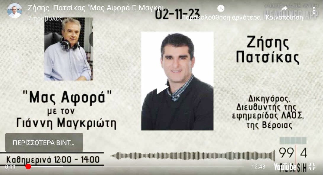 Στην καθημερινή ραδιοφωνική εκπομπή «Μας Αφορά» του πρώην υπουργού Γιάννη Μαγκριώτη στον Flash 99,4 φιλοξενήθηκε ο εκδότης της εφημερίδας μας Ζήσης Μιχ. Πατσίκας. Ο κ. Μαγκριώτης σχολίασε με τον κ. Πατσίκα τα αποτελέσματα των αυτοδιοικητικών εκλογών στην Ημαθία, ενώ ως άριστος γνώστης των θεμάτων της Ημαθίας, ρώτησε για την εξέλιξη του κάθετου άξονα που θα συνδέσει οδικά την Πέλλα με την Ημαθία.