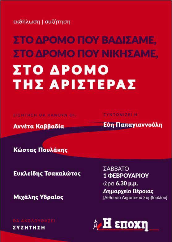 «Στον δρόμο που βαδίσαμε, στον δρόμο που νικήσαμε, στον δρόμο της Αριστεράς», είναι το θέμα της εκδήλωσης που διοργανώνει η εφημερίδα ‘Εποχή’ το Σάββατο 1 Φεβρουαρίου στις 6:30 το απόγευμα, στο δημαρχείο Βέροιας. Ομιλητές, ο πρώην υπουργός Οικονομικών, Ευκλείδης Τσακαλώτος και κατά αλφαβητική σειρά επίσης: Αννέτα Καββαδία, Κώστας Πουλάκης και Μιχάλης Υδραίος. Συντονίστρια θα είναι η Εύη Παπαγιανννούλη.
