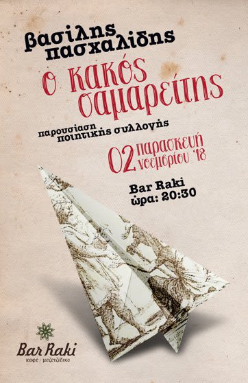 Την ποιητική του συλλογή «Ο Κακός Σαμαρείτης» παρουσιάζει την Παρασκευή 2 Νοεμβρίου στις 8.30μμ στο BAR RAKI στη Νάουσα ο Βασίλης Πασχαλίδης.