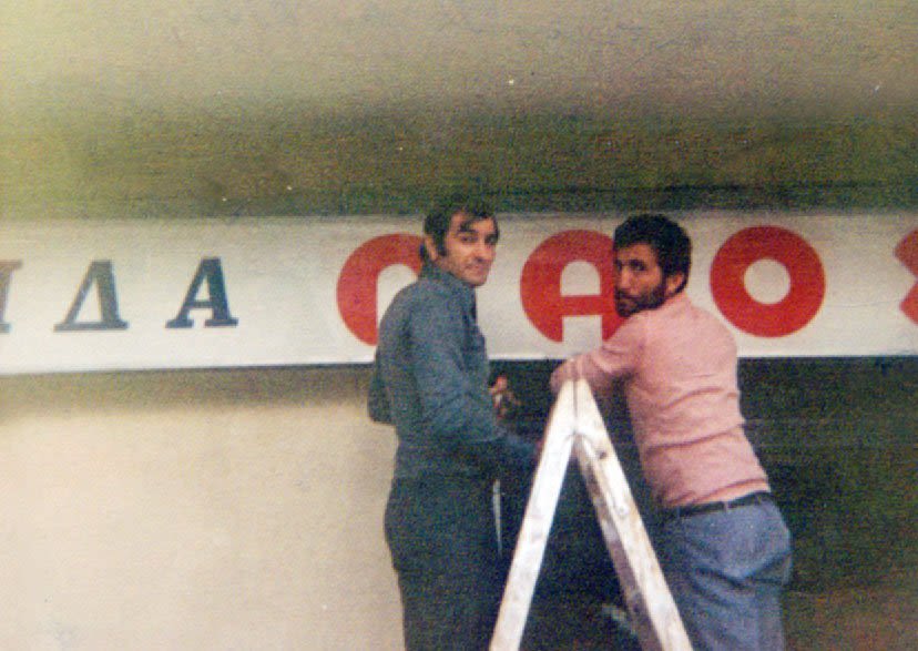 Την άνοιξη του 1976 ο ΛΑΟΣ μετακομίζει στο ισόγειο της οδού Μητροπόλεως 72 (δίπλα από την Εκκλησία του Χριστού), εκεί όπου η εφημερίδα κάνει γερές ρίζες, δυναμώνει και αποκτά τεράστια επιρροή στην κοινωνία. Στην φωτογραφία ο Μιχάλης Πατσίκας με τον Τάκη Κουμούση σκαρφαλωμένοι σε σκάλα, αναρτούν την ταμπέλα.
