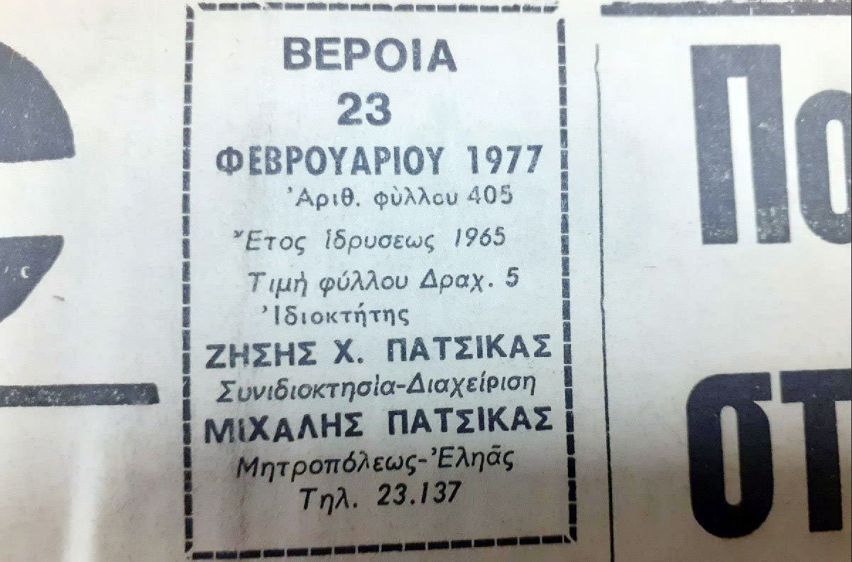 Λίγους μήνες μετά, στις 23 Φεβρουαρίου 1977, στις ίδιες ισόγειες εγκαταστάσεις, που εκτός από τα γραφεία, στεγαζόταν και το τυπογραφείο, ο ΛΑΟΣ από εβδομαδιαίος γίνεται ημερήσιος, αφού η αγάπη του κόσμου, αλλά και οι ανάγκες της πόλης «επέβαλαν» την καθημερινή πλέον έκδοση του. Εκείνη την ημέρα, ο εκδότης και πατέρας μου Μιχάλης Πατσίκας ποζάρει μέσα στο τυπογραφείο, κρατώντας με αγκαλιά (μόλις ενός έτους), δίπλα από τις λινοτυπικές μηχανές και τα δέματα του φρεσκοεκτυπωμένου καθημερινού ΛΑΟΥ.