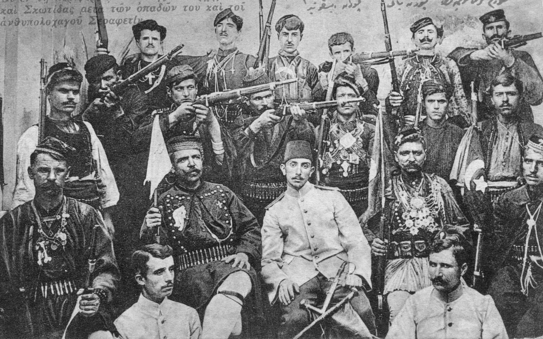 Φωτ. 3. Από δεξιά καθιστοί ο Αθανάσιος Μακρής, ο Πρόδρομος Σκοτίδας, ο λοχαγός Σεραφεντίν, ο Ιωάννης Σημανίκας και ο Δημήτρης Κατσάμπας. Όρθιοι πίσω τους οι οπαδοί τους και μπροστά γονατιστοί άλλοι Τούρκοι αξιωματικοί (αρχείο Ι. Μοσχόπουλος)