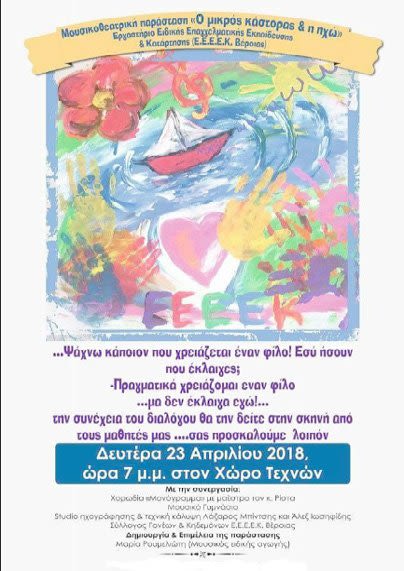 Την μουσικοθεατρική παράσταση «ο μικρός κάστορας και η ηχώ» παρουσιάζει το Εργαστήριο Ειδικής Επαγγελματικής Εκπαίδευσης και Κατάρτισης (ΕΕΕΕΚ) Βέροιας, τη Δευτέρα 23 Απριλίου στις 7.00 μ.μ. στο Χώρο Τεχνών.