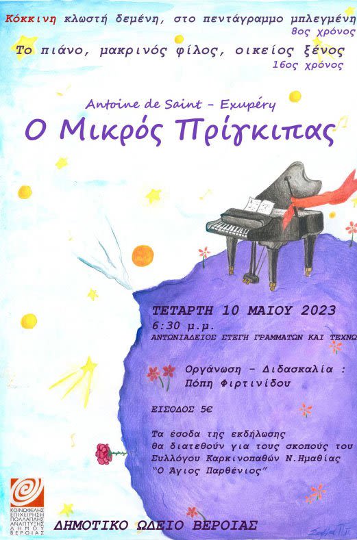 Την Τετάρτη 10 Μαΐου, στις 6.30 μμ στην Αντωνιάδειο Στέγη Γραμμάτων και Τεχνών το τμήμα πιάνου θα παρουσιάσει με μουσικό τρόπο το εμβληματικό έργο του Αντουάν Ντε Σεντ-Εξιπερί «ο Μικρός Πρίγκιπας» που από το 1943 μέχρι σήμερα διδάσκει την αλληλεγγύη και την αγάπη, δίνει χώρο σε όλων των ειδών τα συναισθήματα και προκρίνει την φαντασία έναντι του ορθολογισμού.