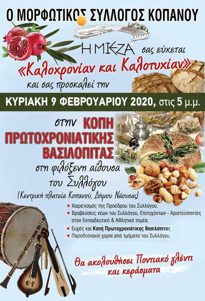 Η πρόεδρος και τα μέλη του Δ.Σ του Μορφωτικού Συλλόγου Κοπανού “Η ΜΙΕΖΑ” σας προσκαλούν στην Κοπή της Πρωτοχρονιάτικης Βασιλόπιτας, την Κυριακή 9 Φεβρουαρίου 2020 και ώρα 5μμ, στην φιλόξενη αίθουσα του συλλόγου μας στην Κεντρική Πλατεία Κοπανού.