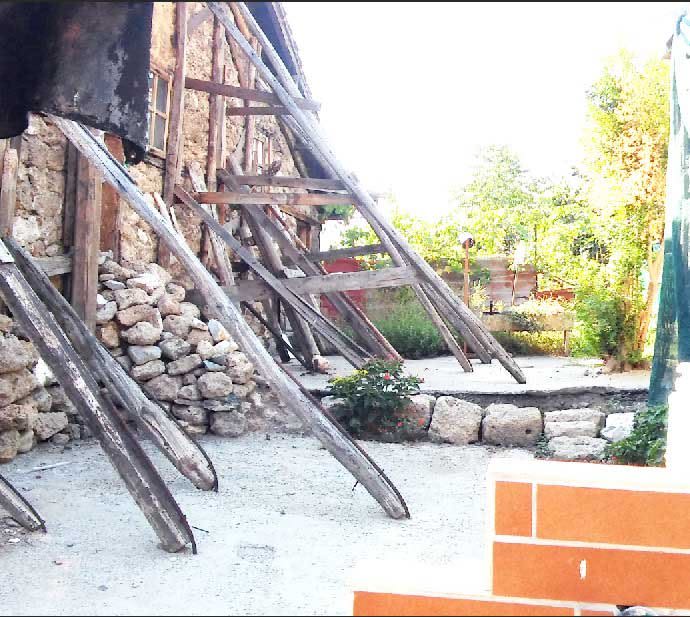 Όπως φαίνεται και στις φωτογραφίες, η δυτική πλευρά του πετρόκτιστου τοιχίου είναι ετοιμόρροπη, στηρίζεται σε πρόχειρα υποστυλώματα, που όπως φαίνεται αν έρθουν οι πρώτες βροχές, ίσως δεν αντέξουν.
