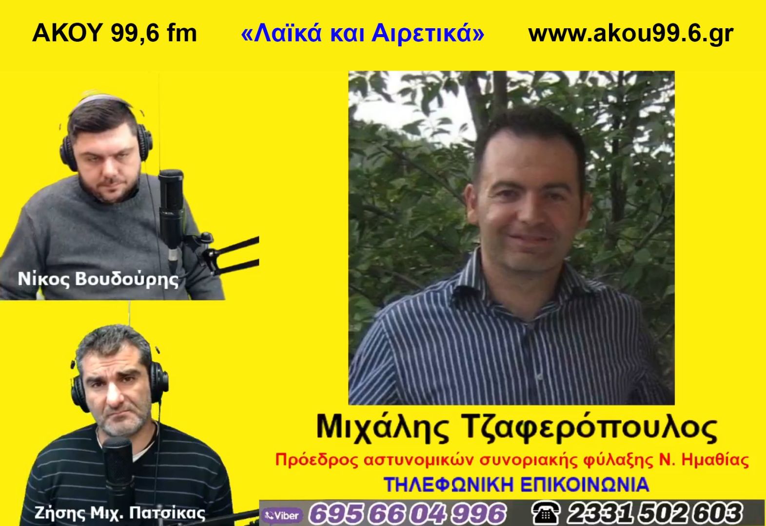 Με αφορμή την μεγάλη επιτυχία της Αστυνομικής Διεύθυνσης Ημαθίας και ειδικότερα του Τμήματος Διαχείρισης Μετανάστευσης(συνεργασία με την ΟΠΚΕ), που εξάρθρωσαν ένα σημαντικό κύκλωμα λαθροδιακίνησης αλλοδαπών, ο πρόεδρος των αστυνομικών συνοριακής φύλαξης Ν. Ημαθίας Μιχάλης Τζαφερόπουλος μίλησε το μεσημέρι της Παρασκευής(19/3) στα Λαϊκά&Αιρετικά στον ΑΚΟΥ 99,6.