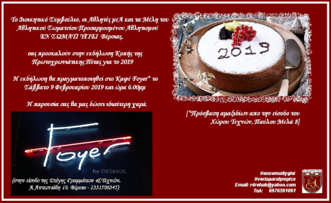 Το Διοικητικό Συμβούλιο, οι Αθλητές μεΑ και τα Μέλη του Αθλητικού Σωματείου Προσαρμοσμένου Αθλητισμού ΕΝ ΣΩΜΑΤΙ ΥΓΙΕΙ  Βέροιας, σας προσκαλούν στην εκδήλωση Κοπής της Πρωτοχρονιάτικης Πίτας για το 2019, που θα πραγματοποιηθεί, το Σάββατο 9 Φεβρουαρίου 2019 στις 6.00μμ Στο Καφέ Foyer* (στην είσοδο της Στέγης Γραμμάτων & Τεχνών, Α.Αντωνιάδη 19, Βέροια)
