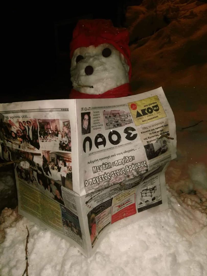 Λίγο μετά τα μεσάνυχτα εμφανίστηκε έξω από τις τυπογραφικές εγκαταστάσεις του ΛΑΟΥ ένας συμπαθεστατος χιονάνθρωπος διαβάζοντας ένα φύλλο της παλαιοτερης καθημερινής εφημερίδας του νόμου Ημαθίας. Επέλεξε μάλιστα το προχθεσινό φύλλο που αναφερόταν στον παγωμένο χιονιά που μας σκέπασε.
