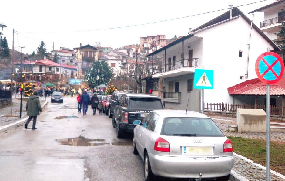 Άδειο το πάρκινγκ στο Σέλι στην είσοδο του χωριού, το βράδυ που ξεκίνησαν οι χριστουγεννιάτικες εκδηλώσεις και η μεγάλη γιορτή στο χωριό, με πολύ κόσμο και σε μόλις λίγα μέτρα ο δρόμος γεμάτος από παράνομα σταθμευμένα αυτοκίνητα.