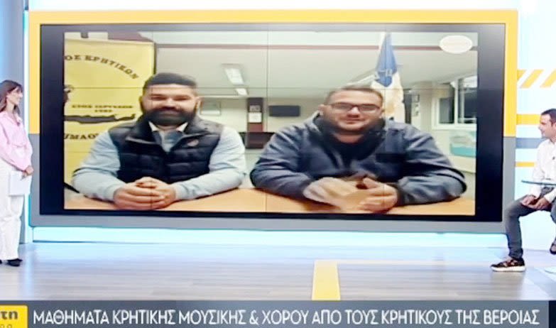 Στην εκπομπή «Κρήτη Σήμερα» της ΚΡΗΤΗ TV φιλοξενήθηκαν ο πρόεδρος και ο ταμίας του Συλλόγου Κρητικών Ν. Ημαθίας, Στέλιος Αλιγιζάκης και Στράτος Λεκανίδης, αντίστοιχα.