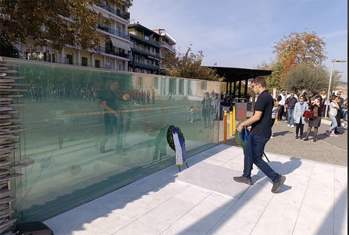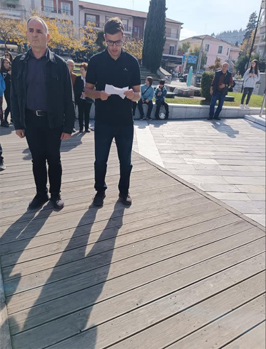 Ο μαθητής Μιχάλης Φιλιππάκης μετά την κατάθεση στεφάνων απήγγειλε το ποίημα «Ο Ύμνος των προγόνων» του Γεώργιου Δροσίνη.