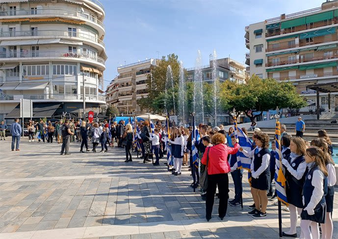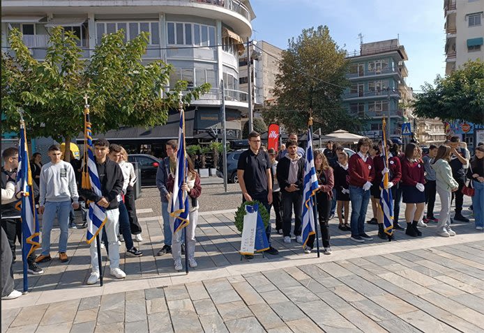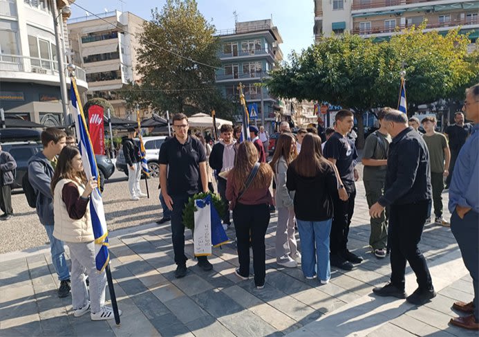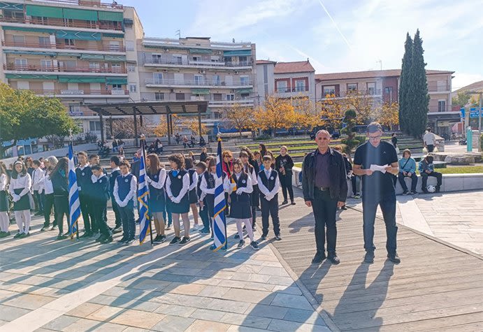 Οι σημαιοφόροι και παραστάτες των δημοτικών, γυμνασίων και λυκείων της πόλης παρατάχθηκαν στην πλατεία μπροστά από το παλαιό δικαστικό μέγαρο, ενώ ο μαθητής του 3ου δημοτικού σχολείου Όθων Λιμπάντσης κατέθεσε στεφάνι στο μνημείο ως εκπρόσωπος της Α/βαθμιας και ο μαθητής του 1ου Γ.Ε.Λ. Μιχάλης Φιλιππάκης εκ μέρους της Β/βαθμιας.
