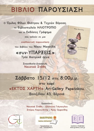 Σε  μια εναλλακτική παρουσίαση που διοργανώνει  ο όμιλος φίλων θέατρου και τεχνών Βέροιας, το κοινό καλείται να γνωρίσει το βιβλίο του Νίκου Μανούδη «συν-ΥΠΑΡΞΕΙΣ τρία θεατρικά έργα», το Σάββατο 15/12/2018 στις 8.00 μ.μ. στο καφέ «ΕΚΤΟΣ ΧΑΡΤΗ» Art Gallery Papatzikou  (Βενιζέλου 43 στη Βέροια). Τρία θεατρικά έργα συν-υπάρχουν σε ένα βιβλίο.  Τρείς «πραγματικοί» θεατρικοί χαρακτήρες συνομιλούν και συγκρούονται με τις αδυναμίες, τους φόβους, τις αγωνίες, τα απωθημένα, τις ενοχές και τα όνειρα τους που πάντα συν- υπάρχουν δίπλα τους, αλλά τώρα αποκτούν πρόσωπο και εισβάλουν σε μια κρίσιμη φάση της ζωής τους. Σκηνοθεσία – Διασκευή: Ναυσικά Στάθη Ερμηνεύουν: Ναυσικά Στάθη, Δέσποινα Γιάγκογλου, Σπύρος Καραγιάννης, Άρης Ορφανίδης