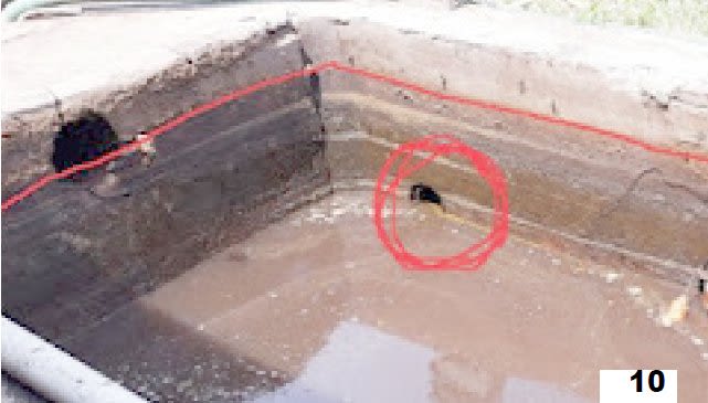 Με κόκκινο, δείχνω μια τρύπα και το επίπεδο του νερού λίγη ώρα πριν, αφού είναι υγρή η δεξαμενή μέχρι την κόκκινη γραμμή. Από την τρύπα, αδειάζουν τα ανεπεξέργαστα απόβλητα στα κανάλια . Αυτό έκαναν και μια ώρα, πριν οι υπηρεσίες , παρουσία εμού και της Αστυνομίας, μπούνε στο εργοστάσιο.