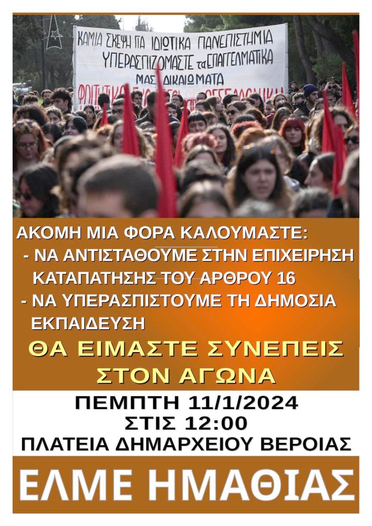 στις μεγάλες κινητοποιήσεις αύριο Πέμπτη 11 Ιανουαρίου σε όλη τη χώρα. Στη Βέροια θα γίνει συλλαλητήριο στην Πλατεία Δημαρχείου στις 12:00. Η ΕΛΜΕ καλεί την εκπαιδευτική κοινότητα του Ν. Ημαθίας σε συμμετοχή, ενώνοντας την φωνή της στο αίτημα, να μην ψηφιστεί ο νόμος για ιδιωτικά – μη κρατικά Πανεπιστήμια.