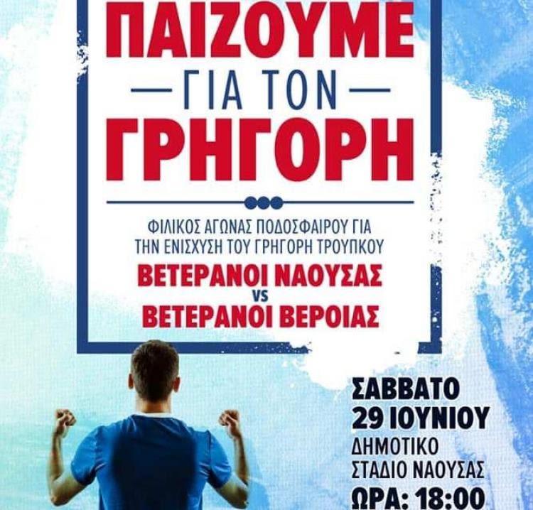 Ο Δήμος Νάουσας στέκεται στο πλευρό της οικογένειας Τρούπκου και το ερχόμενο Σάββατο 29 Ιουνίου στις 18.00 θα πραγματοποιηθεί φιλικό παιχνίδι μεταξύ των βετεράνων της Νάουσας και της Βέροιας στο γήπεδο της Νάουσας. Η τιμή του εισιτηρίου είναι στα 5 ευρώ και η παρουσία είναι το ελάχιστο που μπορεί να κάνει κανείς για να βοηθήσει τον Γρηγόρη. Στο παιχνίδι είναι πιθανό, μάλιστα, να αγωνιστούν και διεθνείς όπως οι Ζαγοράκης, Καφές κλπ..
