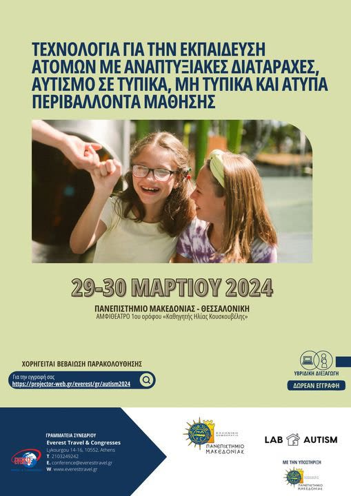 Το συνέδριο θα διεξαχθεί υβριδικά και δια ζώσης στο Πανεπιστήμιο Μακεδονίας, Αίθουσα Συνεδρίων «Καθηγητή Ηλία Κουσκουβέλη», 1ος όροφος και εξ αποστάσεως στο σύνδεσμο https://projector-web.gr/everest/gr/autism2024 στις 29 – 30 Μαρτίου 2024 με την ευκαιρία της Παγκόσμιας Ημέρας για την Ευαισθητοποίηση της Κοινωνίας σχετικά με τα Άτομα με Αυτισμό (2 Απριλίου).Θα δοθούν βεβαιώσεις παρακολούθησης.
