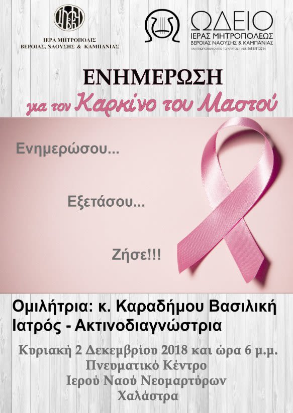 Το Ωδείο της Ιεράς Μητροπόλεως Βεροίας, Ναούσης και Καμπανίας διοργανώνει ομιλία – ενημέρωση για τον καρκίνο του μαστού, την Κυριακή 2 Δεκεμβρίου 2018 και ώρα 6 μ.μ. στο Πνευματικό Κέντρου του Ιερού Ναού των Νεομαρτύρων στην Χαλάστρα, με ομιλήτρια την ιατρό – ακτινοδιαγνώστρια κ. Καραδήμου Βασιλική.