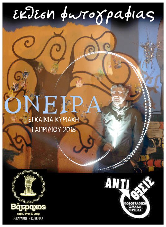 Η Φωτογραφική Ομάδα Βέροιας «Αντίθεσις» φέρνει τα δικά της «Όνειρα», στο καφέ, σνακ και μπαρ «Βάτραχος» (Μ.Καρακωστή 13, Βέροια), από την Κυριακή 1 Απριλίου για τέσσερις εβδομάδες. Τα «Όνειρα» αποτελούν μια ενότητα φωτογραφιών που παρουσιάστηκαν για πρώτη φορά στα πλαίσια της Εύηχης Πόλης, το καλοκαίρι του 2017.