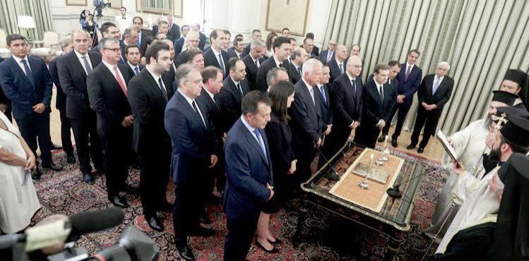 Τα 50 νέα μέλη του υπουργικού συμβουλίου έδωσαν θρησκευτικό όρκο, ενώ της τελετής χοροστάτησε ο αρχιεπίσκοπος Αθηνών και πάσης Ελλάδος Ιερώνυμος.