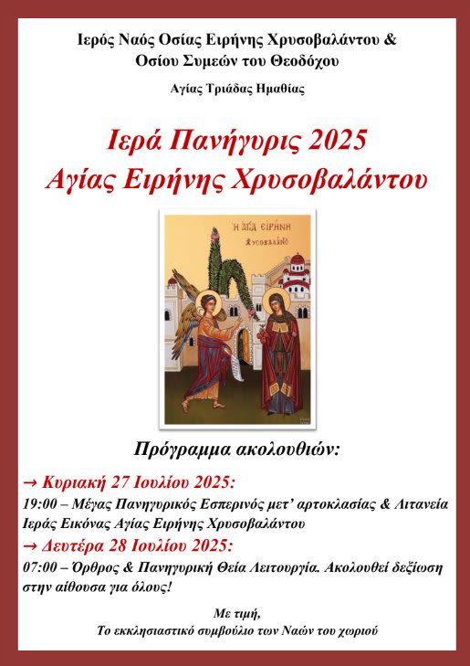 Το εκκλησιαστικό συμβούλιο του Ι.Ν. Αγίας Ειρήνης Χρυσοβαλάντου & Οσίου Συμεών του Θεοδόχου Αγίας Τριάδας σας προσκαλεί στην Ιερά Πανήγυρη.