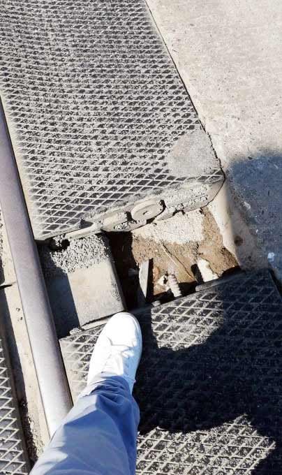 Συγκεκριμένα φαίνεται ότι έχει αφαιρεθεί ένα τμήμα από την μεταλλική σχάρα δίπλα από την σιδηροδρομική γραμμή, που βοηθά την διέλευση των οχημάτων, με αποτέλεσμα να έχει δημιουργηθεί μια μεγάλη τρύπα.