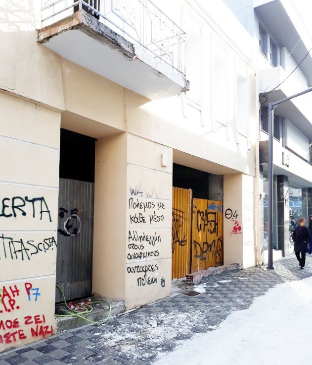 Προσέχεις να μην πας από τον πάγο, ακολουθείς τον καθαρό διάδρομο και σου έρχεται ο σοβάς στο κεφάλι! Ας μεριμνήσει ο ιδιοκτήτης του κτιρίου να επισκευάσει την «παγίδα», αλλιώς η αρμόδια υπηρεσία του δήμου να τον «ενοχλήσει» γιατί τελικά όποιος διέλθει από το σημείο θα πρέπει να είναι προετοιμασμένος να γλιστρήσει ή να του έρθει σοβάς εξ ουρανού!