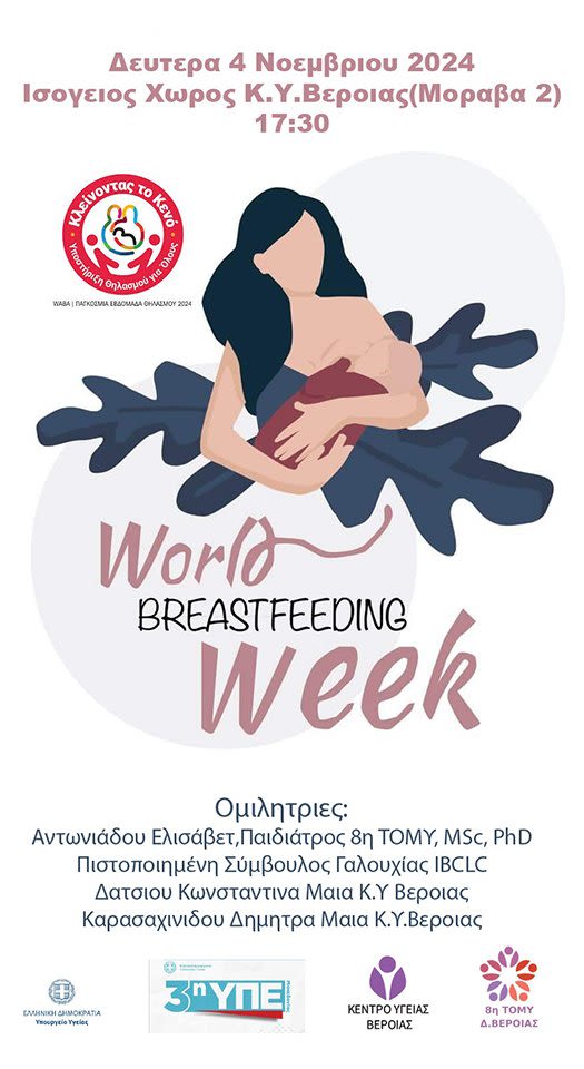 Με αφορμή την Παγκόσμια Εβδομάδα Μητρικού Θηλασμού και τα 10 χρόνια λειτουργίας του τμήματος προετοιμασίας για γονεϊκότητα και μητρικού θηλασμού, το Κέντρο Υγείας Βέροιας σε συνεργασία με την 8η ΤΟΜΥ Βέροιας διοργανώνει τη Δευτέρα 4/11/2024 και ώρα 5:30 μ.μ. στον ισόγειο χώρο του Κ.Υ. Βέροιας (Μοράβα 2, Βέροια) ενημερωτική δράση με θέμα «Κλείνοντας το κενό: Υποστήριξη θηλασμού για όλους»