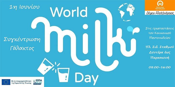 Η Αντιδήμαρχος της Διεύθυνσης Κοινωνικής Προστασίας, Παιδείας και Πολιτισμού του Δήμου Αλεξάνδρειας, κα Λαφαζάνη Ελένη και τα Στελέχη του Κοινωνικού Παντοπωλείου με αφορμή την Παγκόσμια Ημέρα Γάλακτος (World Milk Day), η οποία εορτάζεται κάθε χρόνο την 1η Ιουνίου, καλούν όλους τους πολίτες να ενισχύσουν το έργο του, προσφέροντας γάλα μακράς διαρκείας, το οποίο θα διατεθεί σε ωφελούμενες οικογένειες της δομής.