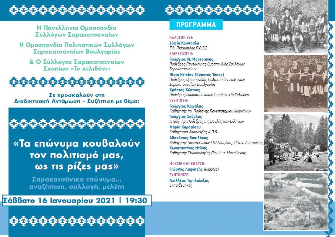 Το Σάββατο 16 Ιανουαρίου 2021 στις 19:30 η Πανελλήνια Ομοσπονδία Συλλόγων Σαρακατσαναίων (Π.Ο.Σ.Σ.), η Ομοσπονδία Πολιτιστικών Συλλόγων Σαρακατσαναίων Βουλγαρίας και ο Σύλλογος Σαρακατσαναίων Σκοπίων το «Χελιδόνι», οργανώνουν διαδικτυακή συζήτηση στρογγυλής τραπέζης με θέμα: «τα Επώνυμα κουβαλούν τον πολιτισμό μας ως τις ρίζες μας».