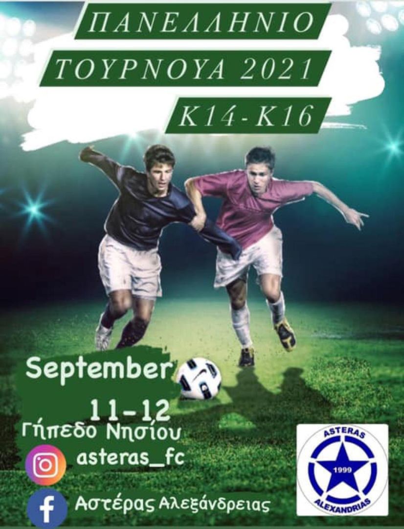 Η Ακαδημία του Αστέρα Αλεξάνδρειας διοργανώνει πανελλήνιο ποδοσφαιρικό τουρνουά στις αθλητικές εγκαταστάσεις του Δ.Δ. Νησίου στις 11 και 12 Σεπτεμβρίου πρωί και απόγευμα για τα τμήματα Κ14 και Κ16.