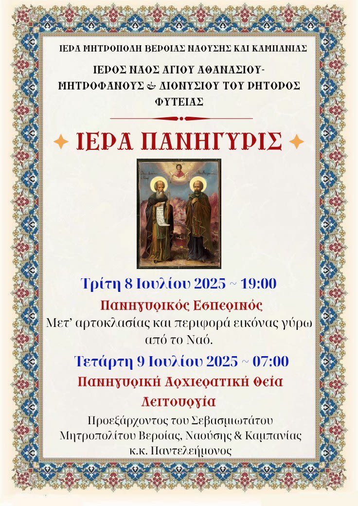 Την Τετάρτη 9 Ιουλίου 2025 πανηγυρίζει ο Ιερός Ναός των Αγ. Αθανασίου του Μεγάλου και των Οσίων Μητροφάνους και Διονυσίου του Ρήτορος, με την ευκαιρία της εορτής των Οσίων, στην Φυτειά Ημαθίας.
